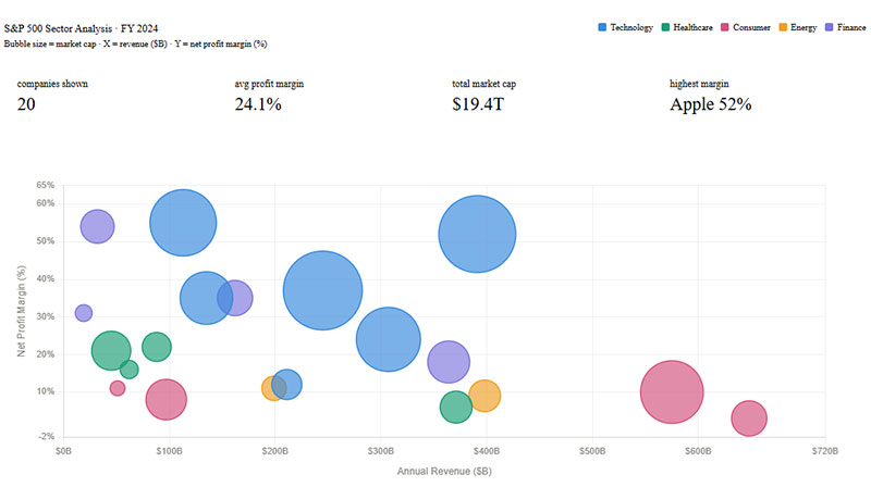 Bubble charts appear across industries wherever three numeric variables need simultaneous comparison. The format is especially strong in financial data visualization, global development analysis, and product portfolio reviews.