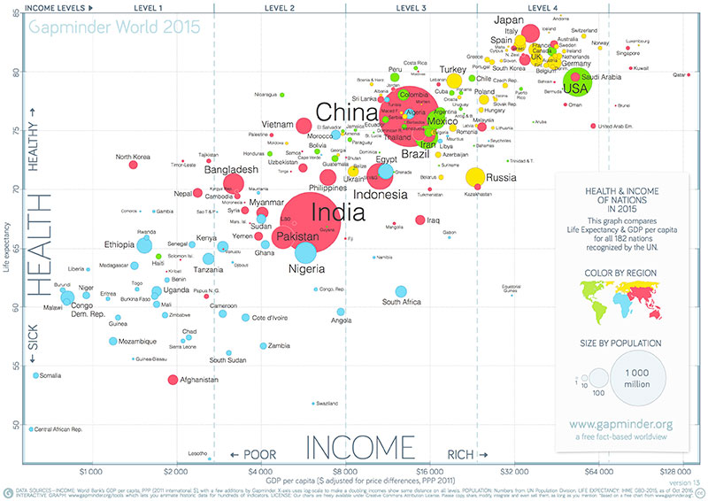 Hans Rosling’s Gapminder tool is still the clearest real-world example of this done well. It maps GDP per capita on the X-axis, life expectancy on the Y-axis, population as bubble size, and world region as color, across 182 countries, and it reads cleanly.