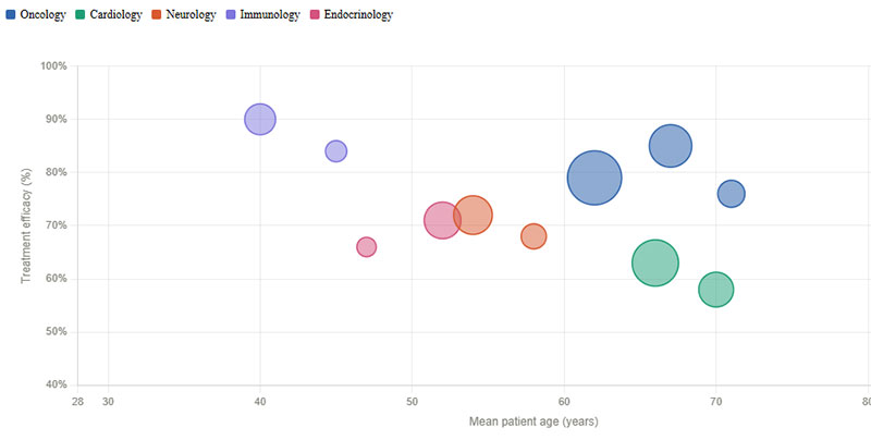 A typical healthcare data visualization use case: treatment cost (X) vs. effectiveness rate (Y) vs. patient volume (bubble size) across treatment protocols.