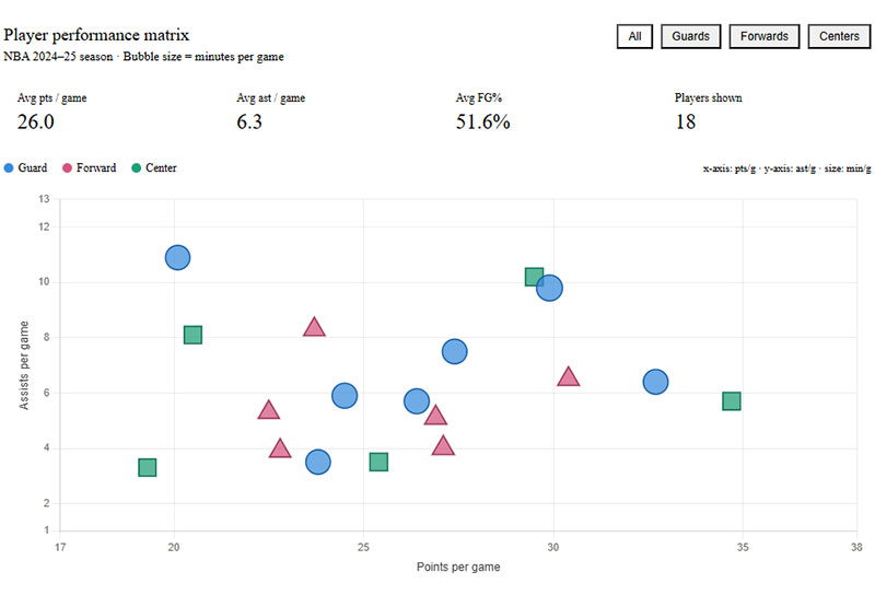 In sports data visualization, bubble charts map player or team performance across multiple metrics. Points scored vs. points allowed vs. win count is a straightforward NBA example. The format also appears in player scouting: speed vs. accuracy vs. games played.